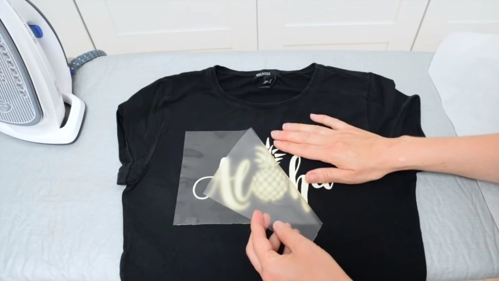 1)Calienta ligeramente el tejido con la plancha y coloca el diseño en el lugar en el que quieras estamparlo. Es muy importante que la cara de la lámina transportadora quede hacia arriba.