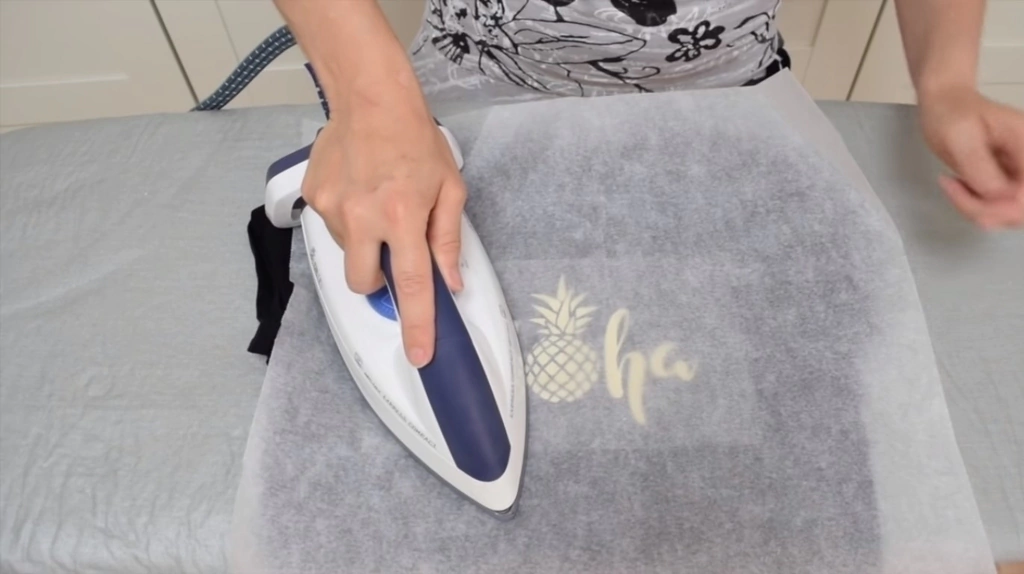 2)El siguiente paso consiste en colocar encima el papel de horno y presionar con la plancha durante unos 10/15 segundos. La plancha se aplica sin vapor y a unos 150 grados de temperatura. Presiona siempre haciendo fuerza hacia abajo, sin desplazarla lateralmente
