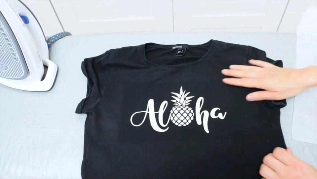 1)Calienta ligeramente el tejido con la plancha y coloca el diseño en el lugar en el que quieras estamparlo. Es muy importante que la cara de la lámina transportadora quede hacia arriba.