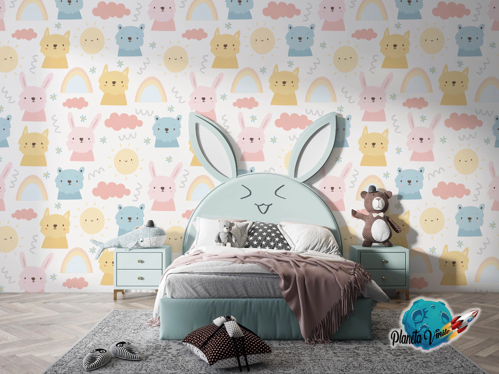 Diseño adorable con arcoíris, nubes, caritas de sol y simpáticos animalitos en tonos pastel que transmiten alegría y ternura. Ideal para dormitorios de bebés, niños y espacios de juego. Este vinilo decorativo infantil es fácil de aplicar, no deja residuos y se limpia con un paño húmedo. Su estilo colorido y moderno estimula la imaginación y aporta calidez a cualquier rincón.